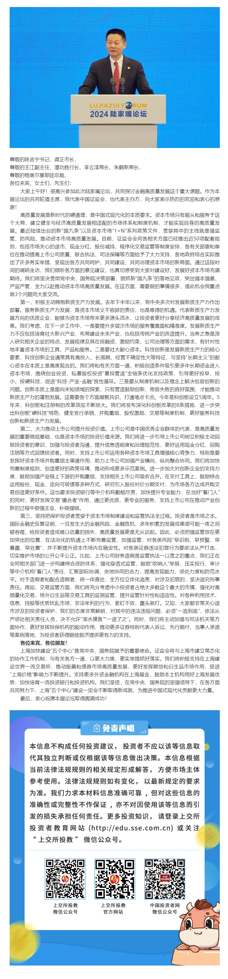 【证监会发布】吴清主席在2024陆家嘴论坛开幕式上的主旨演讲