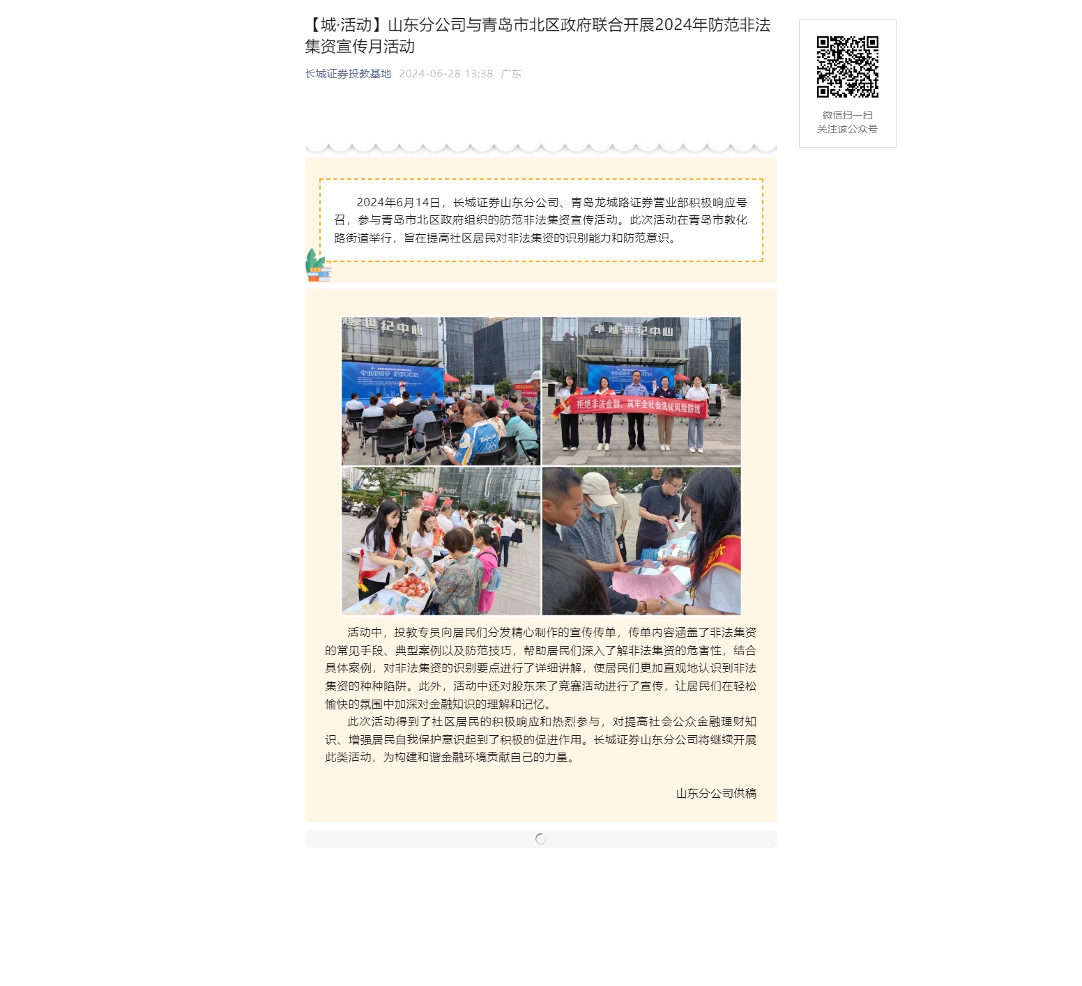 【城·活动】山东分公司与青岛市北区政府联合开展2024年防范非法集资宣传月活动