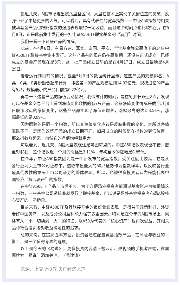 【上交所投教】媒体视角 央广经济之声《易说:已满月的中证A50ETF联接基金表现如何?》