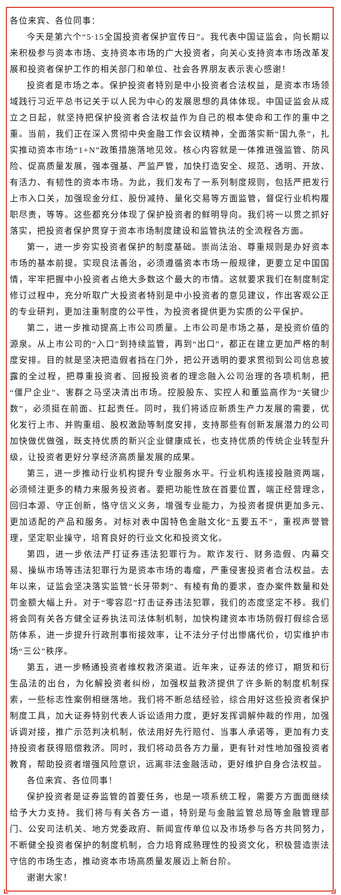【上交所投教】5·15专栏 吴清主席在2024年“5·15全国投资者保护宣传日”活动上的致辞