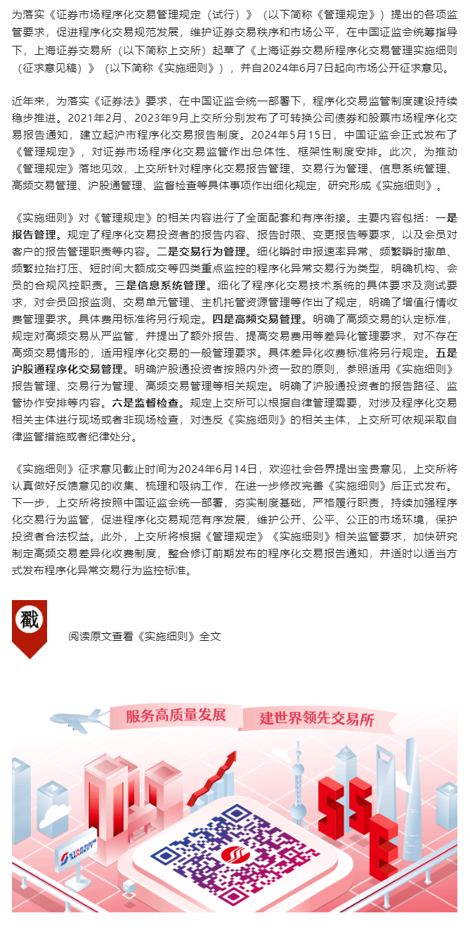 【上交所发布】上交所制定程序化交易管理实施细则 推动程序化监管措施落地见效